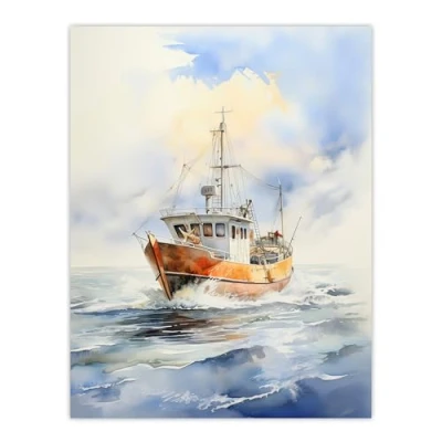 Artery8 Fishing Boat at Sea Detailed Watercolour Seascape Extra Large XL Wall Art Poster Print