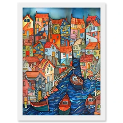 Artery8 Fishing Village Canal Folk Art Watercolour Painting Artwork Framed A3 Wall Print