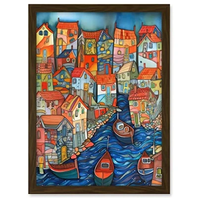 Artery8 Fishing Village Canal Folk Art Watercolour Painting Artwork Framed A3 Wall Print