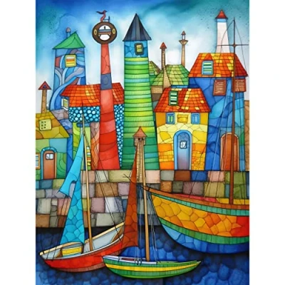 Artery8 Fishing Village Folk Art Watercolour Painting Extra Large XL Wall Poster Print