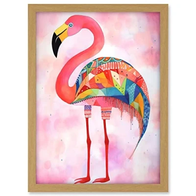 Artery8 Flamingo Bird With Multicolour Patterns Folk Art Watercolour Painting Artwork Framed A3 Wall Print