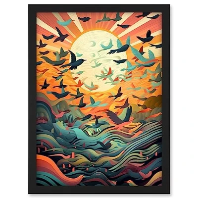 Artery8 Flock of Birds Flying at Sunrise Modern Folk Art Artwork Framed A3 Wall Print