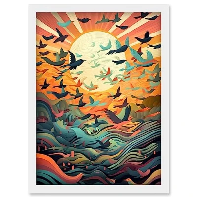 Artery8 Flock of Birds Flying at Sunrise Modern Folk Art Artwork Framed Wall Print A4