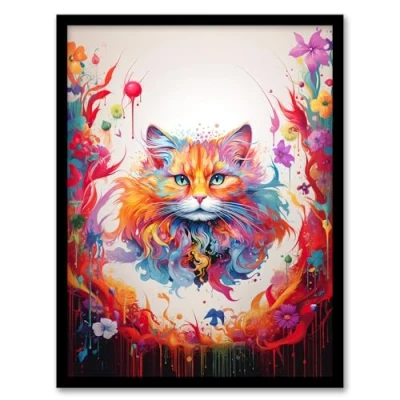 Artery8 Floofster Fluffy Cat Lover Pet Gift Portrait Pink Blue Orange Fantasy Artwork Painting Framed Wall Art Print A4