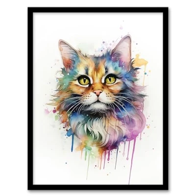 Artery8 Floofster Fluffy Cat Lovers Gift Watercolour Pet Portrait Painting Artwork Framed Wall Art Print A4