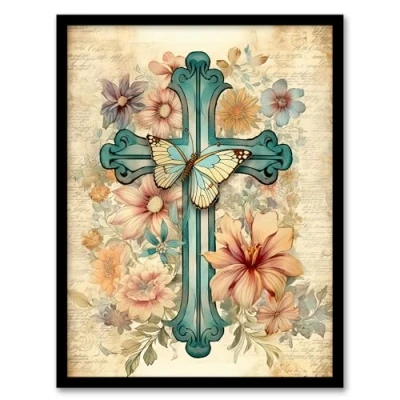 Artery8 Flowery Cross Upcycle Watercolour Painting Pastel Colour Flower Blooms and Butterfly Artwork Framed Wall Art Print A4