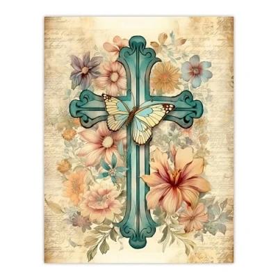 Artery8 Flowery Cross Upcycle Watercolour Painting Pastel Colour Flower Blooms and Butterfly Large Wall Art Poster Print Thick Paper 18X24 Inch