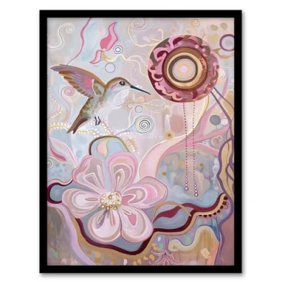 Artery8 Folk Art Hummingbird with Pink Abstract Flowers Living Room Artwork Framed Wall Print A4