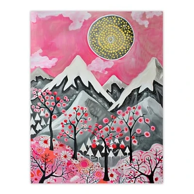 Artery8 Folk Art Mountain Range Sunset Cherry Blossom Living Room Large Wall Poster Print Thick Paper 18X24 Inch