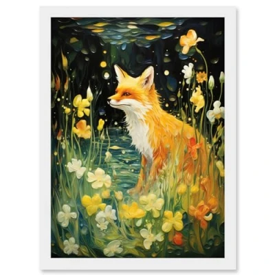Artery8 Fox Dream Floral Yellow Oil Painting Orange White Dreamscape of Lily Flowers in Spring Artwork Framed Wall Art Print A4