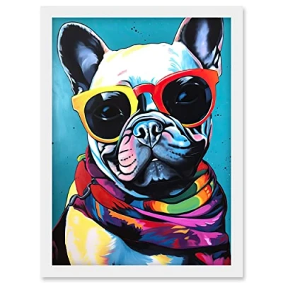 Artery8 French Bulldog in Sunglasses and Bandana Folk Art Artwork Framed Wall Print A4