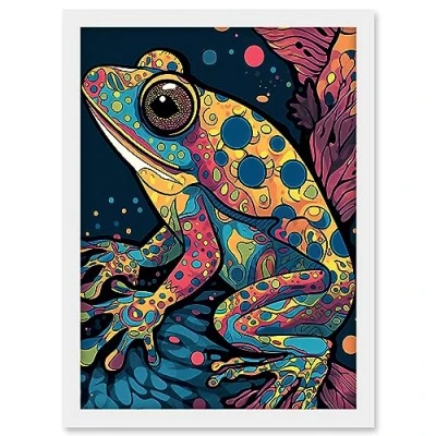 Artery8 Frog Portrait Acrylic Painting Colourful Psychedelic Patterns Aquatic Animal Modern Pop Art Artwork Framed A3 Wall Print