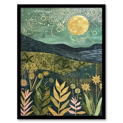 Artery8 Full Moon Floral Landscape Folk Art Painting Living Room Artwork Framed Wall Print A4