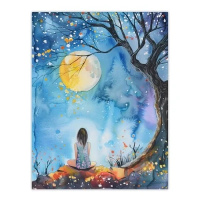 Artery8 Full Moon Gazing Autumn Night Watercolour Living Room Large Wall Art Poster Print Thick Paper 18X24 Inch
