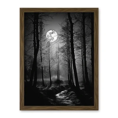Artery8 Full Moon Over Misty Forest Black and White Photo Artwork Framed Wall Art Print 18X24 Inch