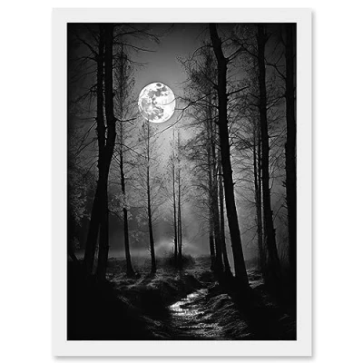 Artery8 Full Moon Over Misty Forest Black and White Photo Artwork Framed Wall Art Print A4
