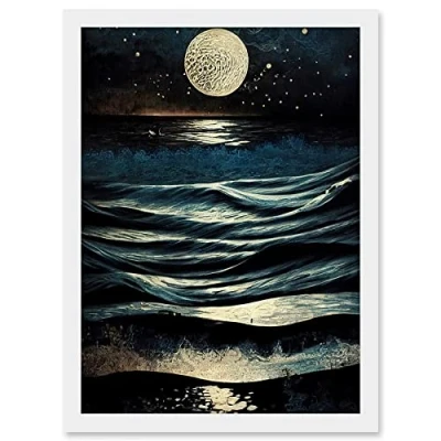 Artery8 Full Moon Rising Over Clear Night Sky Tidal Waves Artwork Framed A3 Wall Art Print