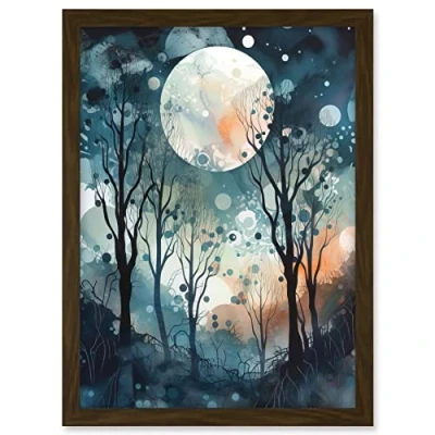 Artery8 Full Moon Winter Forest Landscape Snowfall over Trees at Night Artwork Framed A3 Wall Art Print