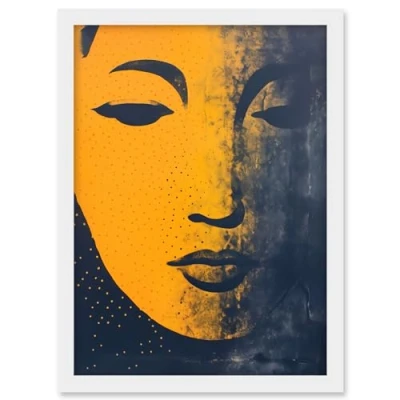 Artery8 Gandhara Buddha Face in Indigo Blue and Amber Abstract Minimalist Risograph Artwork Framed A3 Wall Art Print