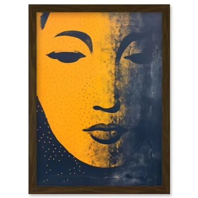 Artery8 Gandhara Buddha Face in Indigo Blue and Amber Abstract Minimalist Risograph Artwork Framed Wall Art Print A4