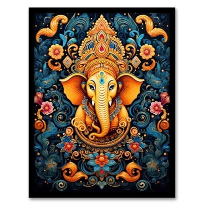 Artery8 Ganesha and Flowers Hindu Concept Art Orange Blue Vibrant Ornate Floral Pattern Design with Elephant Artwork Framed Wall Print A4