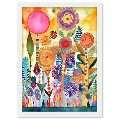 Artery8 Garden Flowers In Spring Folk Art Watercolour Painting Artwork Framed A3 Wall Print