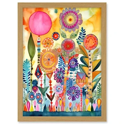 Artery8 Garden Flowers In Spring Folk Art Watercolour Painting Artwork Framed A3 Wall Print