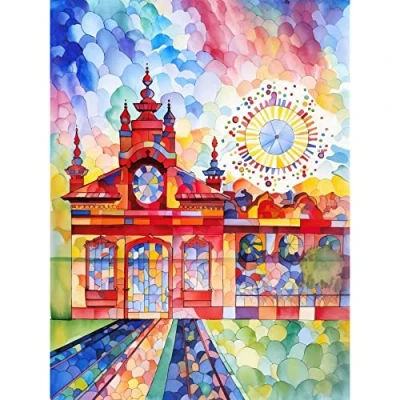 Artery8 Gaudi Inspired Rural Train Station Folk Art Large Wall Poster Print Thick Paper 18X24 Inch