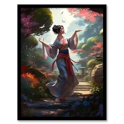 Artery8 Geisha Performing in Tranquil Garden Painting Graceful Traditional Dance Spring Bloom Flowers Artwork Framed Wall Art Print A4