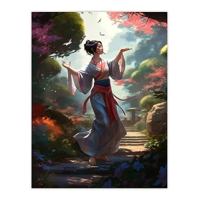 Artery8 Geisha Performing in Tranquil Garden Painting Graceful Traditional Dance Spring Bloom Flowers Extra Large XL Wall Art Poster Print