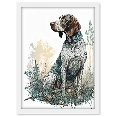 Artery8 German Pointer Dog Sitting in Field Modern Detailed Illustration Artwork Framed A3 Wall Art Print