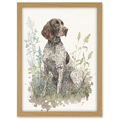 Artery8 German Pointer Dog Sitting in Field Modern Detailed Pastel Watercolour Illustration Artwork Framed A3 Wall Art Print