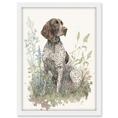 Artery8 German Pointer Dog Sitting in Field Modern Detailed Pastel Watercolour Illustration Artwork Framed A3 Wall Art Print