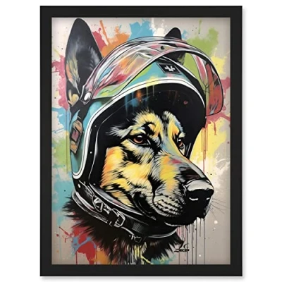 Artery8 German Shepherd Dog Wearing Motorcycle Helmet Artwork Framed Wall Art Print A4