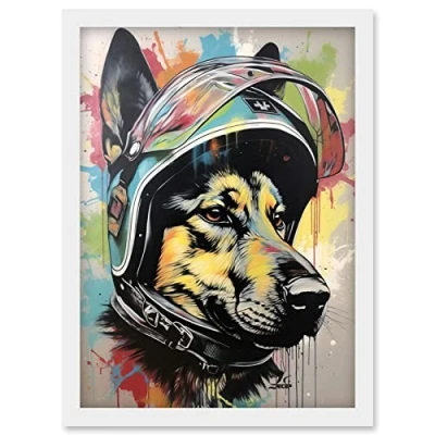 Artery8 German Shepherd Dog Wearing Motorcycle Helmet Artwork Framed Wall Art Print A4