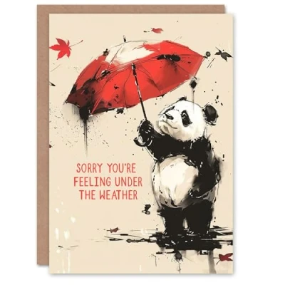 Artery8 Get Well Card Panda Bear Red Umbrella Autumn For Child Kids Son Daughter Greeting