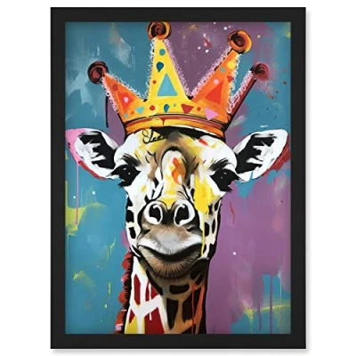Artery8 Giraffe Wearing a Crown King Queen Modern Pop Art Artwork Framed Wall Print A4