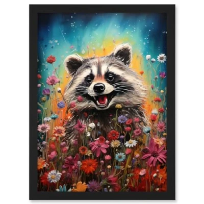 Artery8 Gleeful Racoon Quirky Portrait Spring Makes Everything Better Oil Painting Kids Bedroom Blooming Wildflower Meadow Artwork Framed A3 Wall Art Print