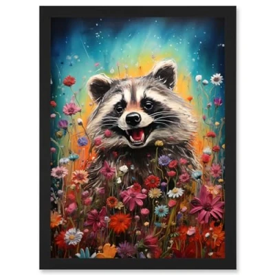 Artery8 Gleeful Racoon Quirky Portrait Spring Makes Everything Better Oil Painting Kids Bedroom Blooming Wildflower Meadow Artwork Framed Wall Art Print A4