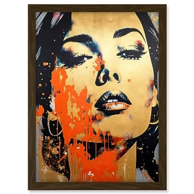 Artery8 Gold Beauty Woman Face with Earrings Red Splat Paint Linocut Portrait Teen Room Artwork Framed A3 Wall Art Print