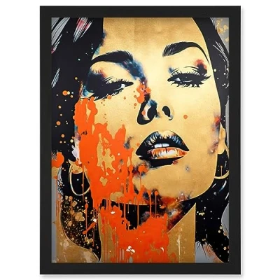 Artery8 Gold Beauty Woman Face with Earrings Red Splat Paint Linocut Portrait Teen Room Artwork Framed Wall Art Print A4