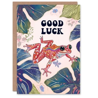 Artery8 Good Luck Card Cute Colourful Jungle Frog Bright Folk Art For Her Gran Sister Niece Daughter Wife Woman Greeting