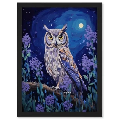 Artery8 Great Horned Owl in Lavender Field Oil Painting Blue Purple Full Moon Night the Countryside Artwork Framed Wall Art Print A4