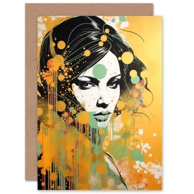 Artery8 Green Gold Woman Portrait for Wife Her Mum Sister Daughter Mom Gran Nan Birthday Thank You Congratulations Blank Art Greeting Card