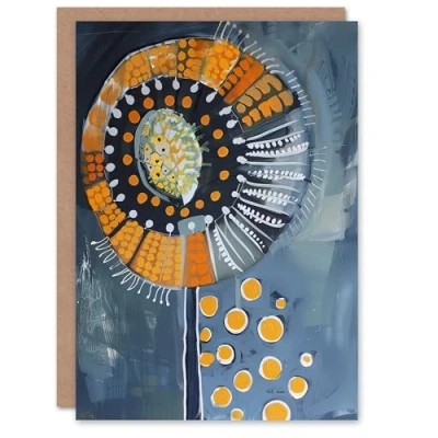 Artery8 Greeting Card Abstract Dandelion Orange Blue Floral Folk Art Blank For Him Or Her Birthday