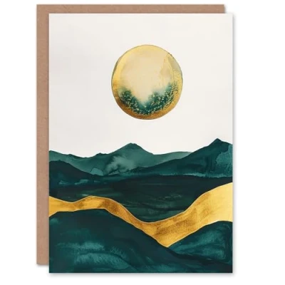 Artery8 Greeting Card Abstract Full Moon Seascape Dark Green Gold Boho Blank For Him Or Her Art Birthday