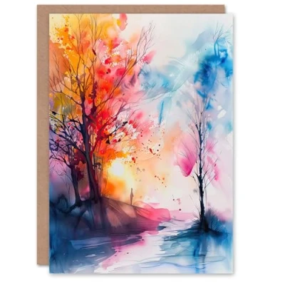Artery8 Greeting Card Autumn Forest Sunrise Dream Watercolour Painting Blank For Him Or Her Art Birthday