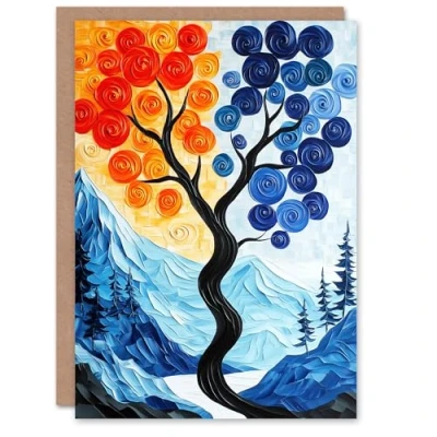Artery8 Greeting Card Autumn To Winter Tree Folk Art Mountain Landscape Blank For Him Or Her Birthday