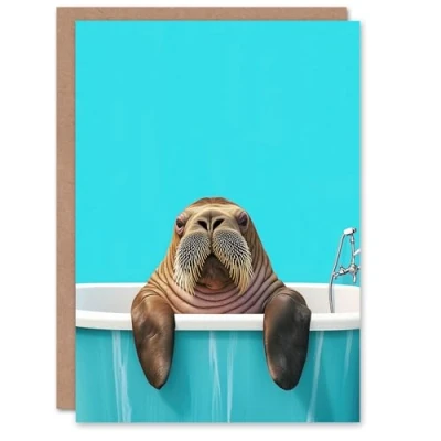 Artery8 Greeting Card Bath Time Cute Walrus in Bathtub Vibrant Fun Blank For Him Or Her Art Birthday