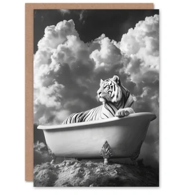 Artery8 Greeting Card Big Cat Lover Tiger Bathtub Black White Surreal Blank For Him Or Her Art Birthday